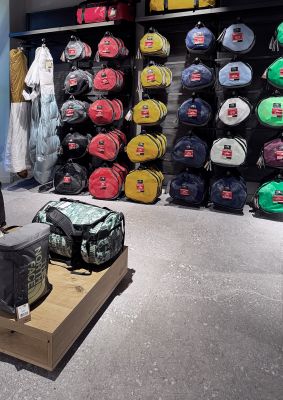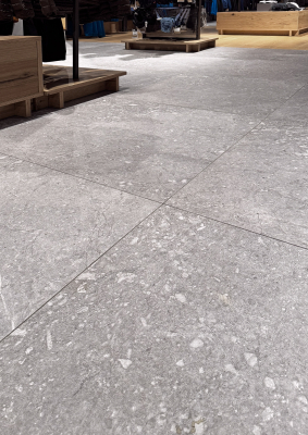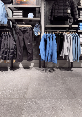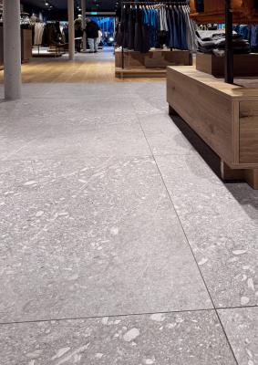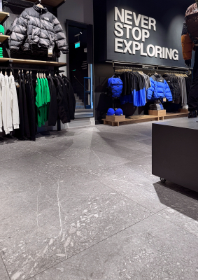 El espacio comercial se articula a partir de un pavimento continuo que aporta carácter y solidez al conjunto. La gráfica de Pietra di Gré, rica en matices y con una marcada inspiración pétrea, genera una superficie de aspecto natural que encaja con la identidad outdoor de la marca y contribuye a construir una atmósfera sobria y contemporánea.